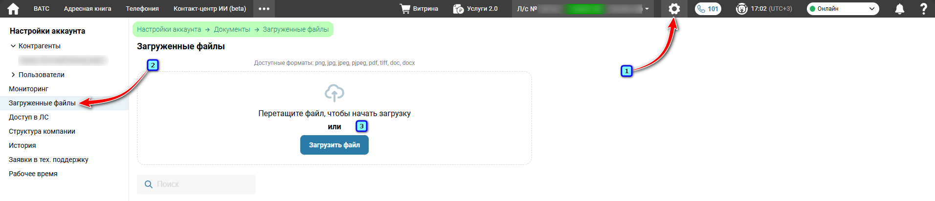 Чтобы загрузить файлы перейдите через иконку шестеренки в «Настройки аккаунта» → «Документы» → «Загруженные файлы».