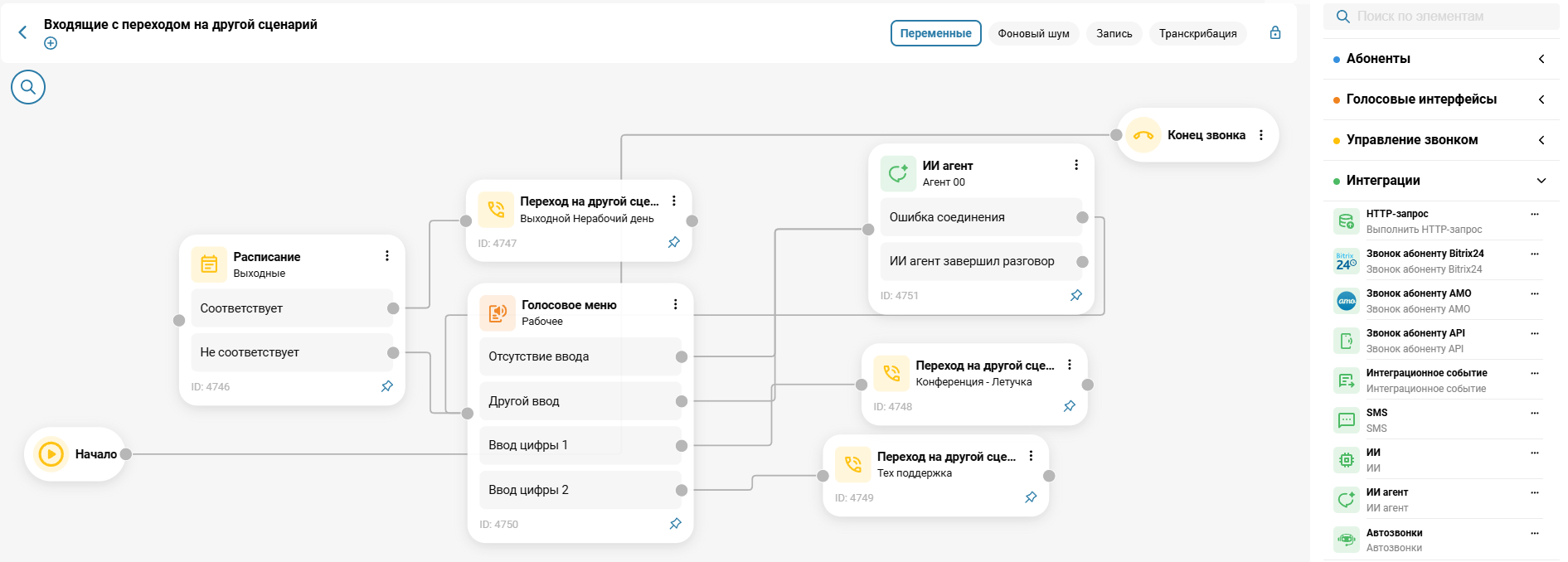 - Например, если вы обрабатываете заказы и обращения клиентов, создайте основной сценарий для входящих вызовов и используйте элемент «Переход на другой сценарий» для маршрутизации по типу обращения: заказ, возврат, техническая поддержка и т. д.