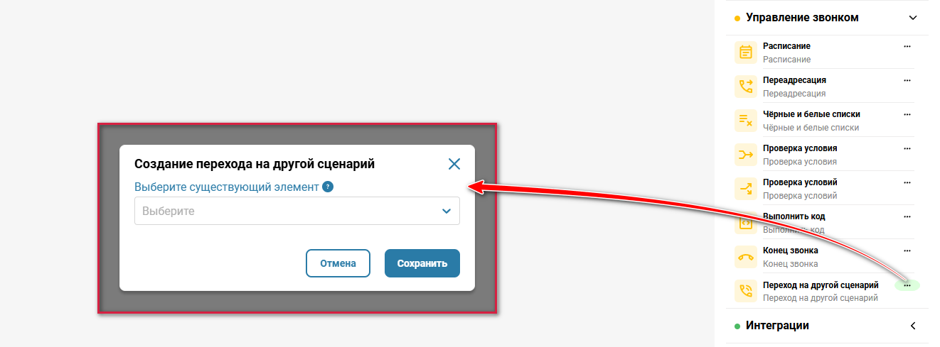 В разделе «ВАТС 2.0» → вкладка «Сценарий звонков» → справа в боковом меню нажмите на три точки на иконке элемента «Переход на другой сценарий» либо перетащите элемент мышкой на поле сценария.