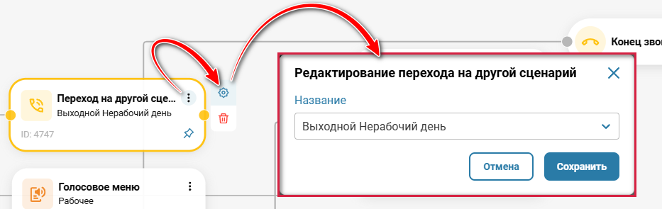 Элемент «Переход на другой сценарий» упрощает и структурирует логику обработки вызовов. Он позволяет разбивать сложный процесс на несколько небольших сценариев, каждый из которых отвечает за свою часть работы.