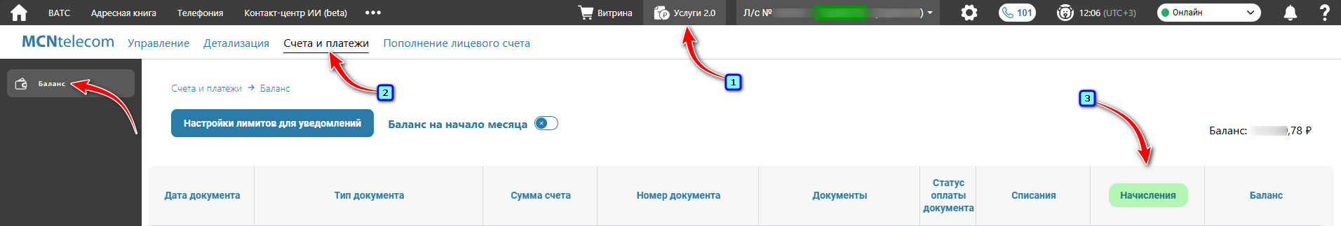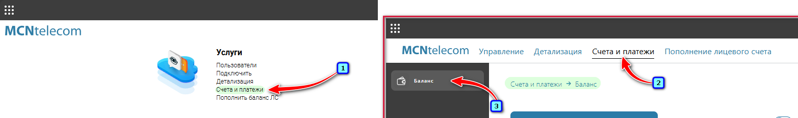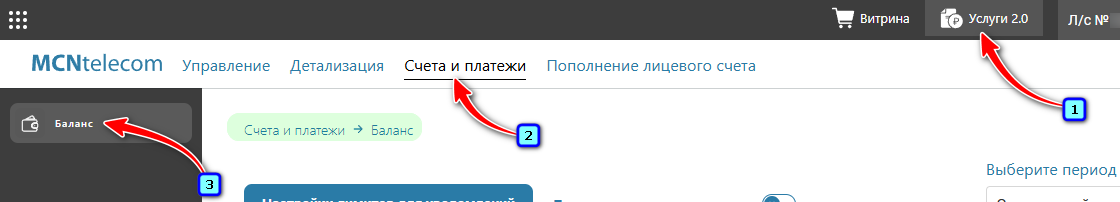 Или в верхнем меню Личного кабинета нажмите на «Услуги 2.0» → вкладка «Счета и платежи» → меню слева «Баланс».