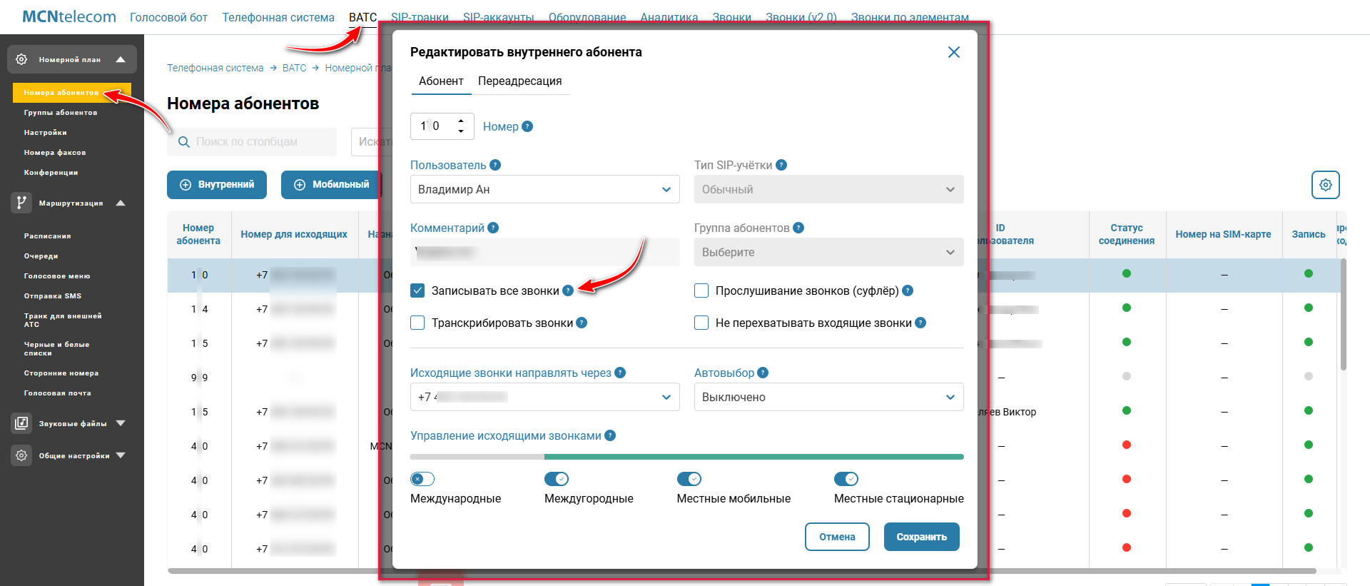 - Включение записи в настройках элемента «Абонент» (внутренний, внешний, мобильный) в сценарии звонков.