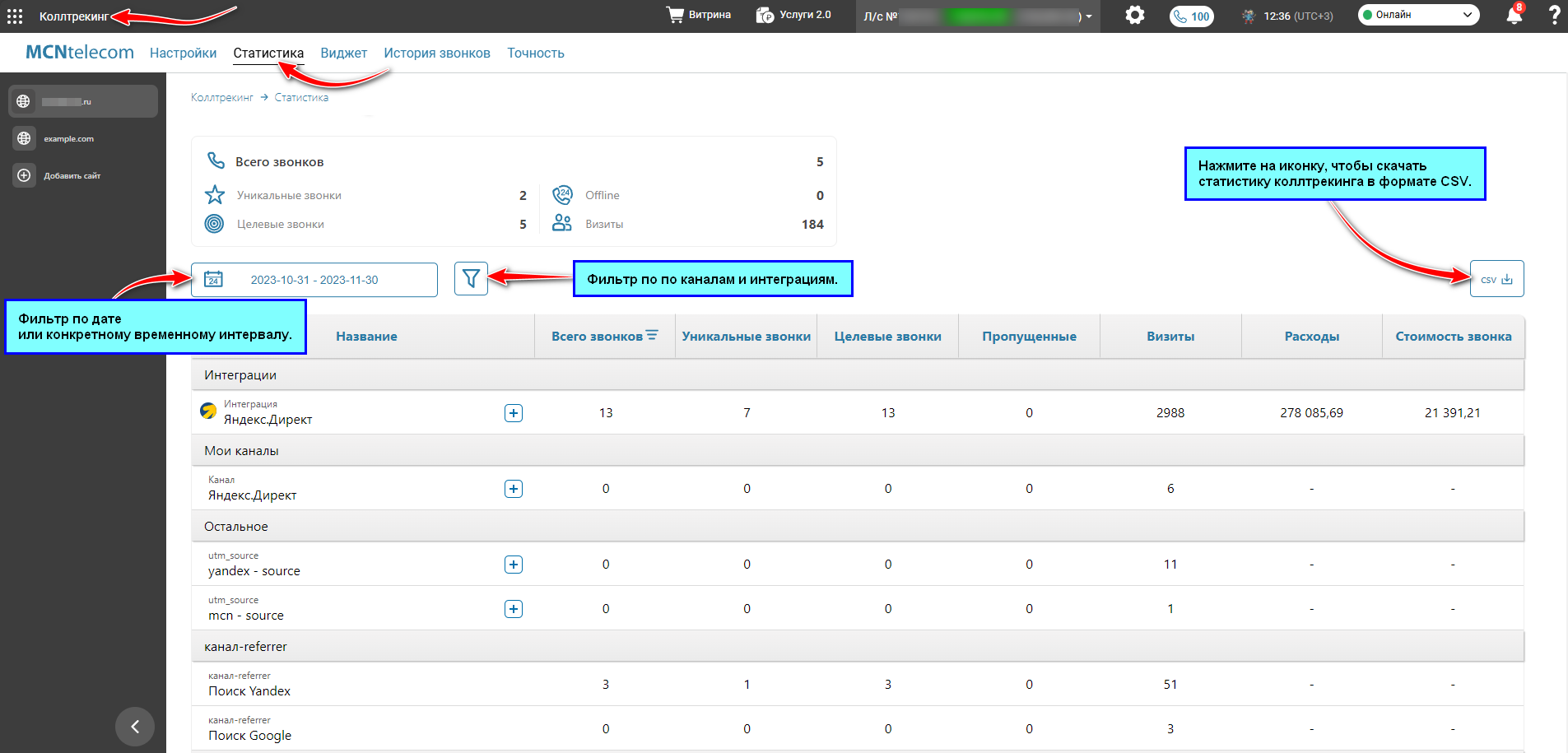 Для просмотра статистики коллтрекинга перейдите в раздел «Коллтрекинг» → вкладка «Статистика» и выберите сайт в меню слева.