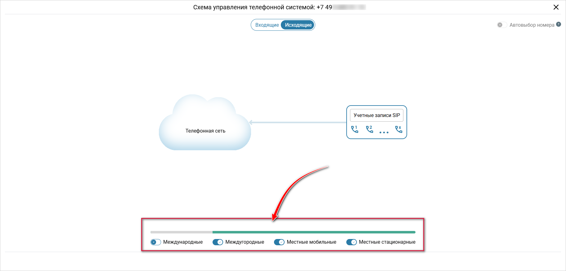 Для того, чтобы запретить/ограничить исходящую связь, используйте ползунок, соответствующий нужному направлению. По умолчанию разрешены все исходящие вызовы с телефонного номера.