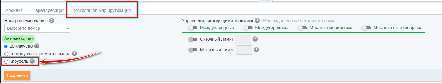 | ✅ Примечание: Опция «Карусель» входит в опцию «Автовыбор номера по региону», но одновременно они не работают. Для исходящей маршрутизации требуется выбрать одну из них. |