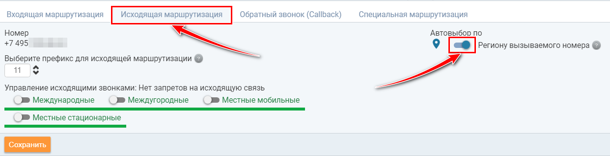 На каждом телефонном номере, который будет использоваться для автовыбора номера по региону или карусели, требуется активировать опцию «Автовыбор номера по Региону».