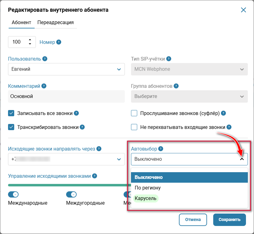 На вкладке «Абонент» в поле «Автовыбор» выберите «Карусель». Подробнее см. «Настройка исходящей маршрутизации абонента».