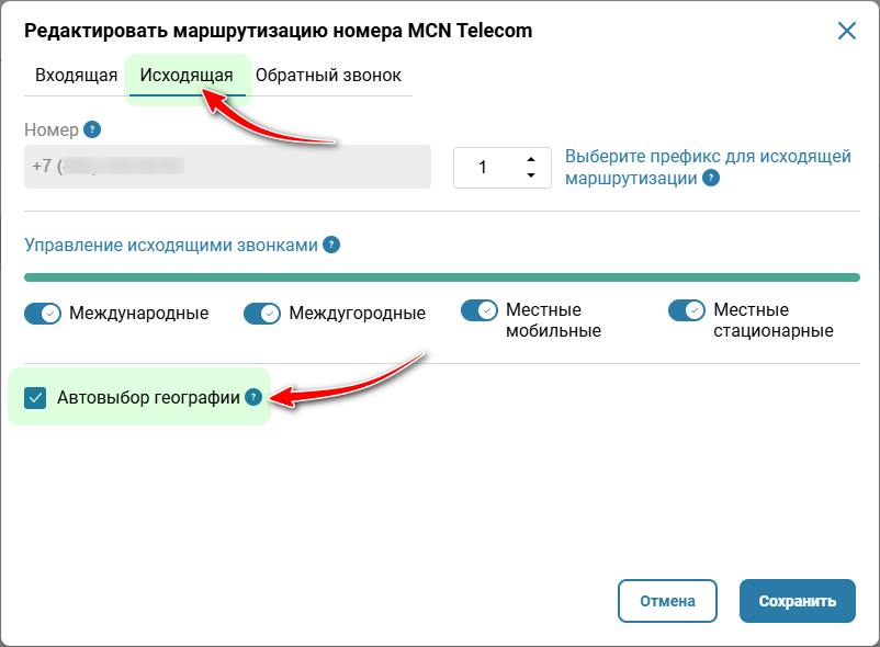 В открывшемся модальном окне «Редактировать маршрутизацию номера MCN Telecom» на вкладке «Исходящая» отметьте флажком «Автовыбор географии». Подробнее см. «Сторонние номера».