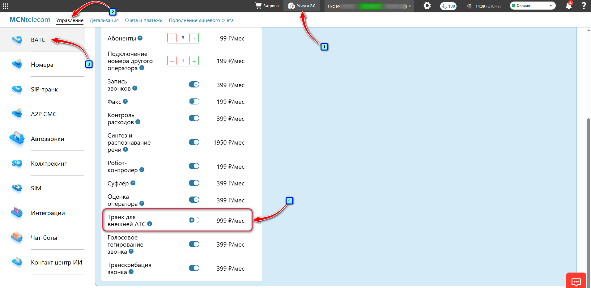 Перейдите через верхнее меню в раздел в «Услуги 2.0» → вкладка «Управление» → меню слева «ВАТС» и напротив пункта «Транк для внешней АТС» сдвиньте ползунок вправо.