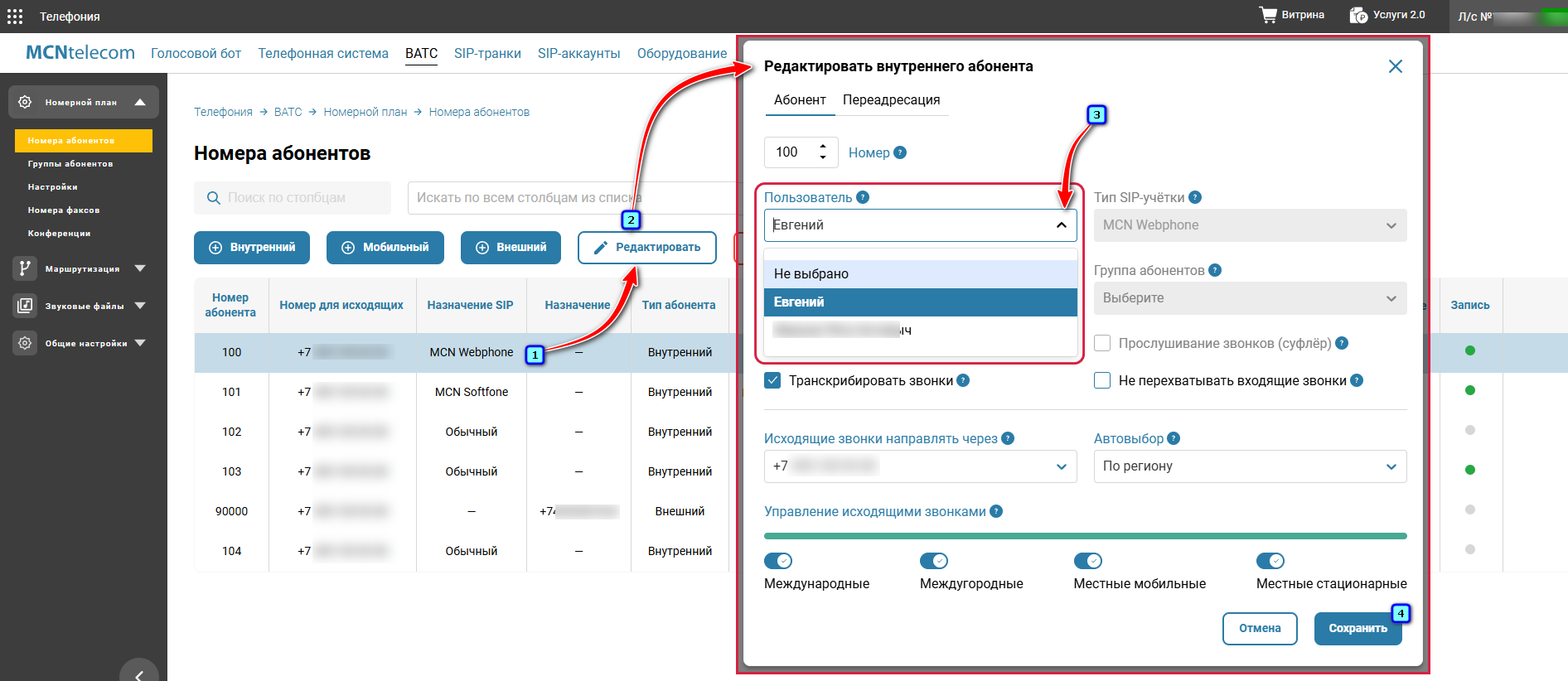 - Перейдите на вкладку «ВАТС» → меню слева «Номерной план» → «Номера абонентов».