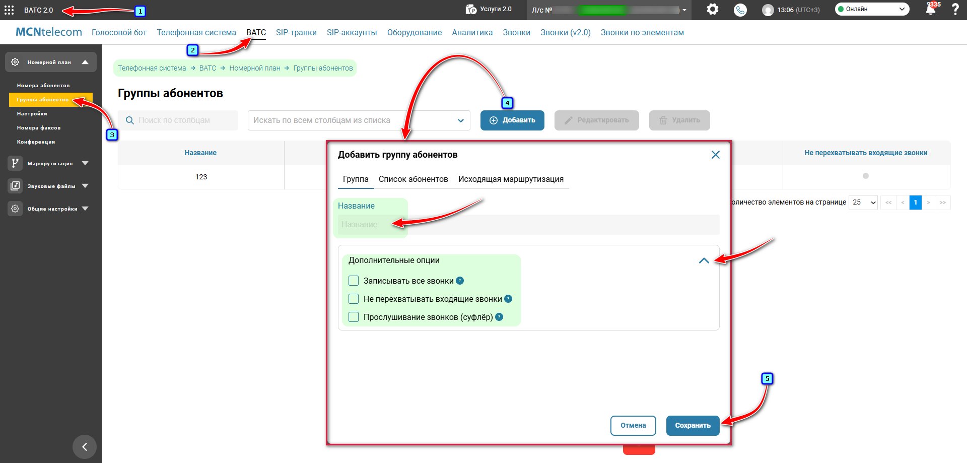 Перейдите в раздел «ВАТС» → вкладка «Настройка» → меню слева «Номерной план» → «Группы абонентов».