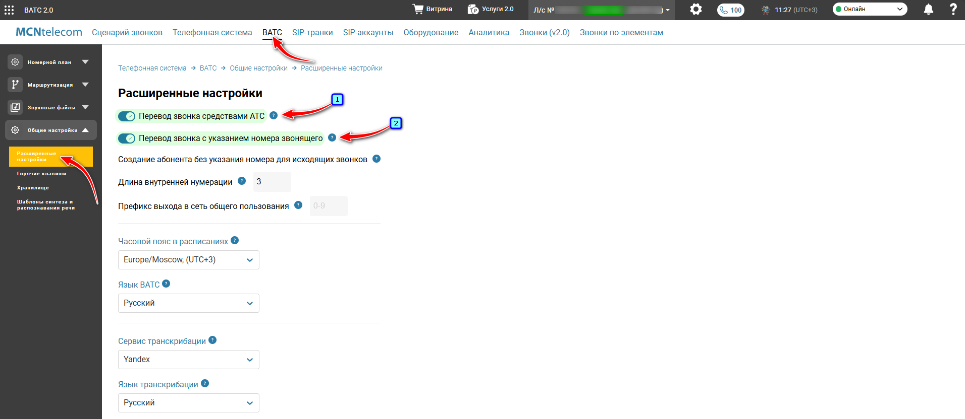 Чтобы включить опцию перевода звонка средствами виртуальной АТС, перейдите в раздел «ВАТС» → вкладка «Настройки» → «Общие настройки» → «Расширенные настройки».