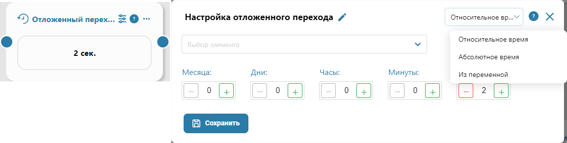 - Относительное время — указывается время, по истечении которого пользователь будет направлен дальше по сценарию.