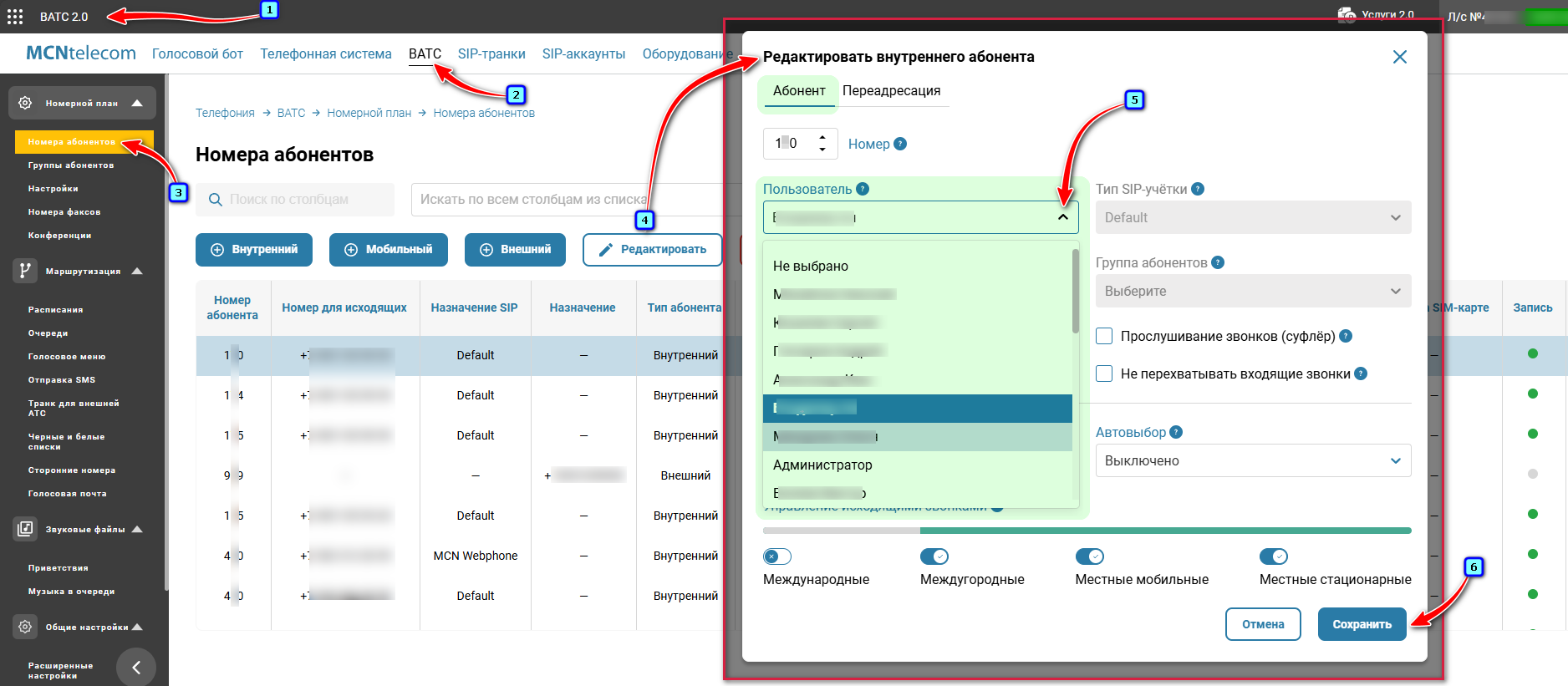 - Перейдите на вкладку «ВАТС» → меню слева «Номерной план» → «Номера абонентов».