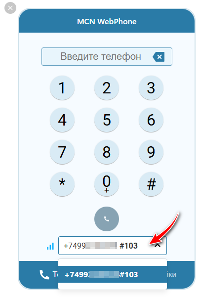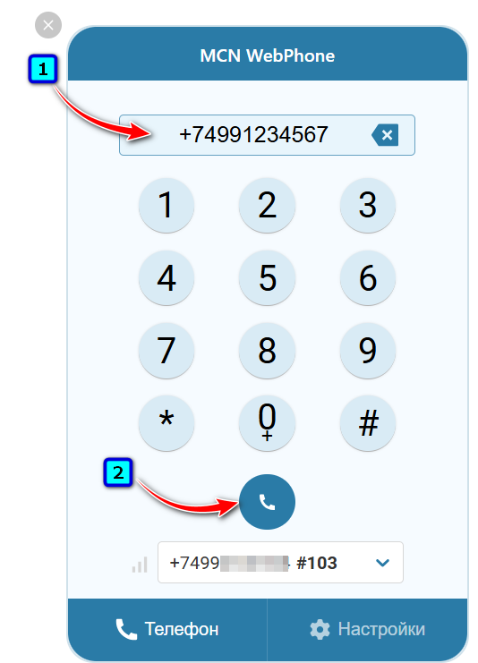 ✅Примечание: MCN WebPhone можно перемещать по экрану в пределах браузера. Перетащите вебфон левой кнопкой мыши за верхнюю панель. Чтобы скрыть вебфон, нажмите на кнопку «Закрыть» (Х на сером круге).Теперь вы можете совершать вызовы через MCN WebPhone. Наберите номер в формате — 84951234567 и нажмите кнопку вызова.