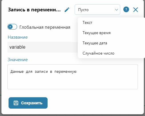 В данной инструкции описываются элементы сценария из раздела «Переменные», используемые для действий бота.