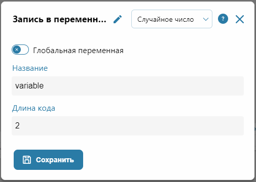 Случайное число — записывает в переменную случайное число длины, указанной в поле Длина кода.