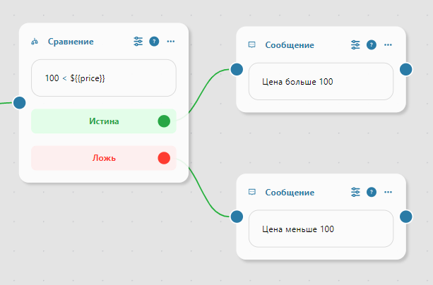 Значения переменных также можно сравнивать с пустым полем, проверяя таким образом находится ли в них что-то или нет. Сравниваем значение переменной name с пустотой. Пусто ли name? Таким образом сценарий пойдет по ветви Истина если name пусто (в неё ничего не записано), иначе (в переменной name содержится некоторое значение) по ветви Ложь.