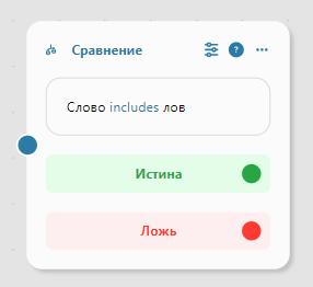Текст сообщения (Переменная) — текст, который будет проверяться на выполнение условий. Если текст пользователя содержит слово из первой и одновременно из второй строки, будет выбрана первая строка как приоритетная.
