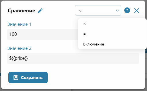 - Включение — (истина если Значение 1 содержит в себе Значение 2)