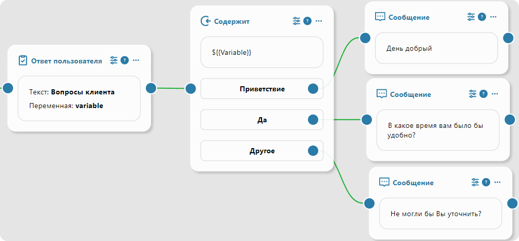 ✅ Примечание: В поле передаётся именно текст, который будет проверяться. Т.е. если вы хотите проверять сообщение пользователя, вам необходимо использовать схему указанную на рисунке, сохраняя ответ пользователя в переменную.Уточняющая фраза — позволяет указать условие или ключевую фразу, инициирующую включение соответствующего внешнего модуля, блока или другого компонента в основной скрипт чат-бота.
