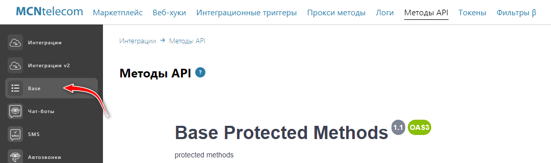 Чтобы воспользоваться методами API, перейдите в раздел Интеграции → вкладка Методы API.