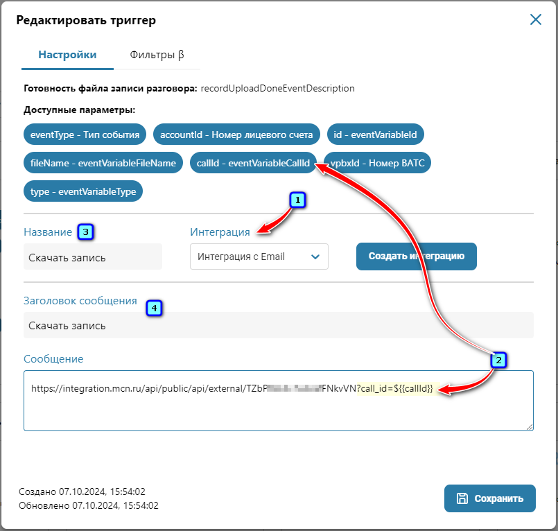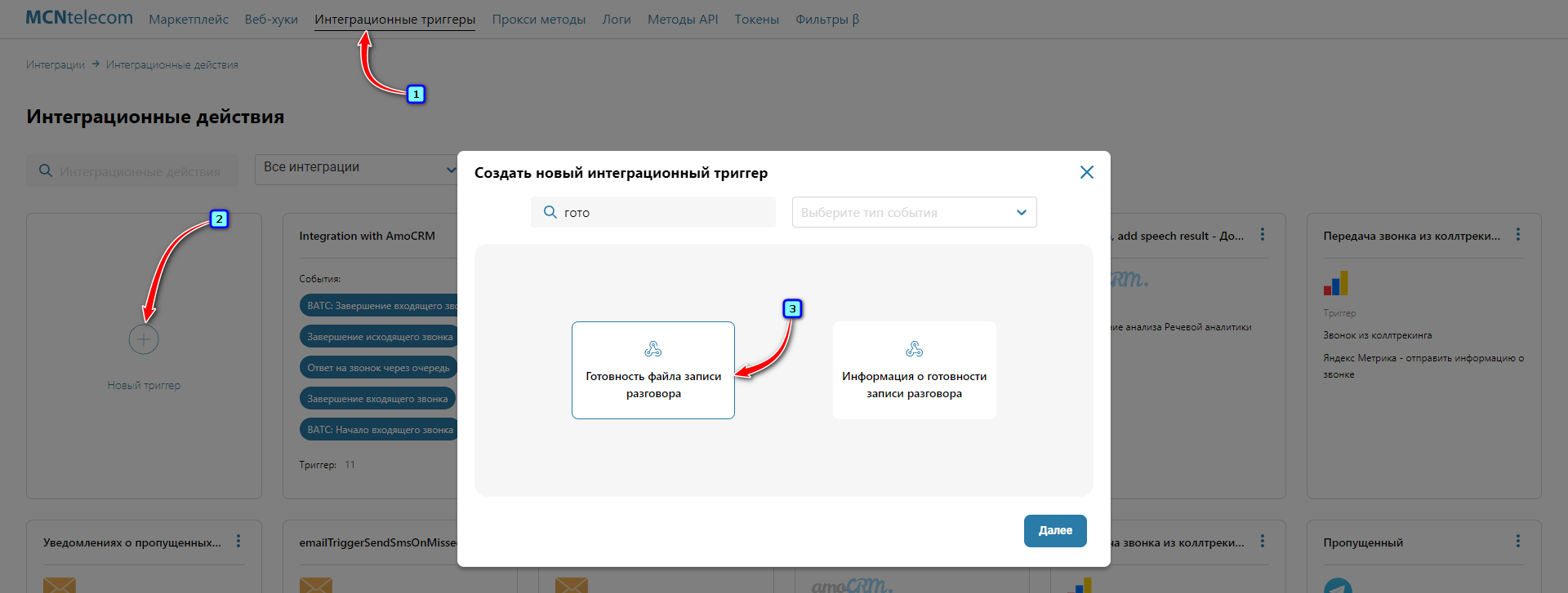 Перейдите в раздел «Интеграция» → «Интеграционные действия» и создайте триггер «Готовность файла записи разговора».