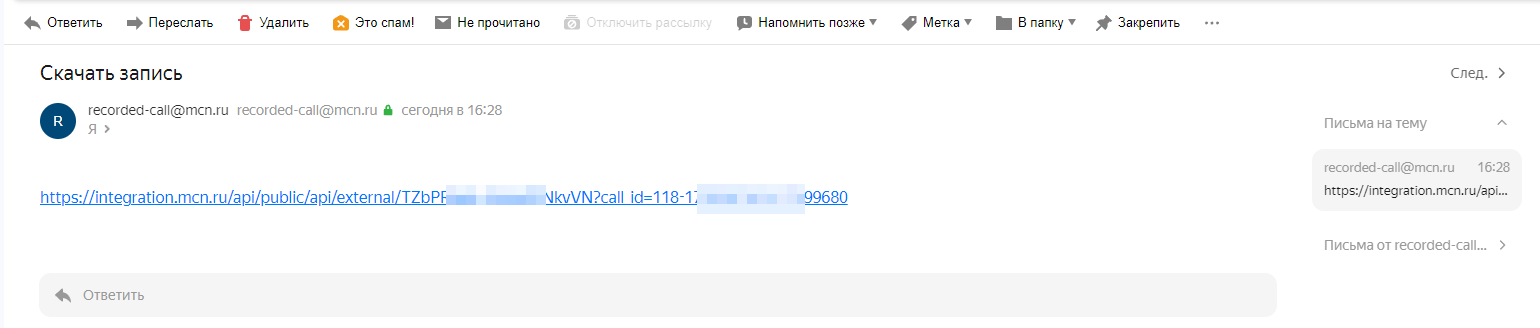 В поле Сообщение вставьте скопированную ссылку из прокси-метода «Скачивание записи разговора».