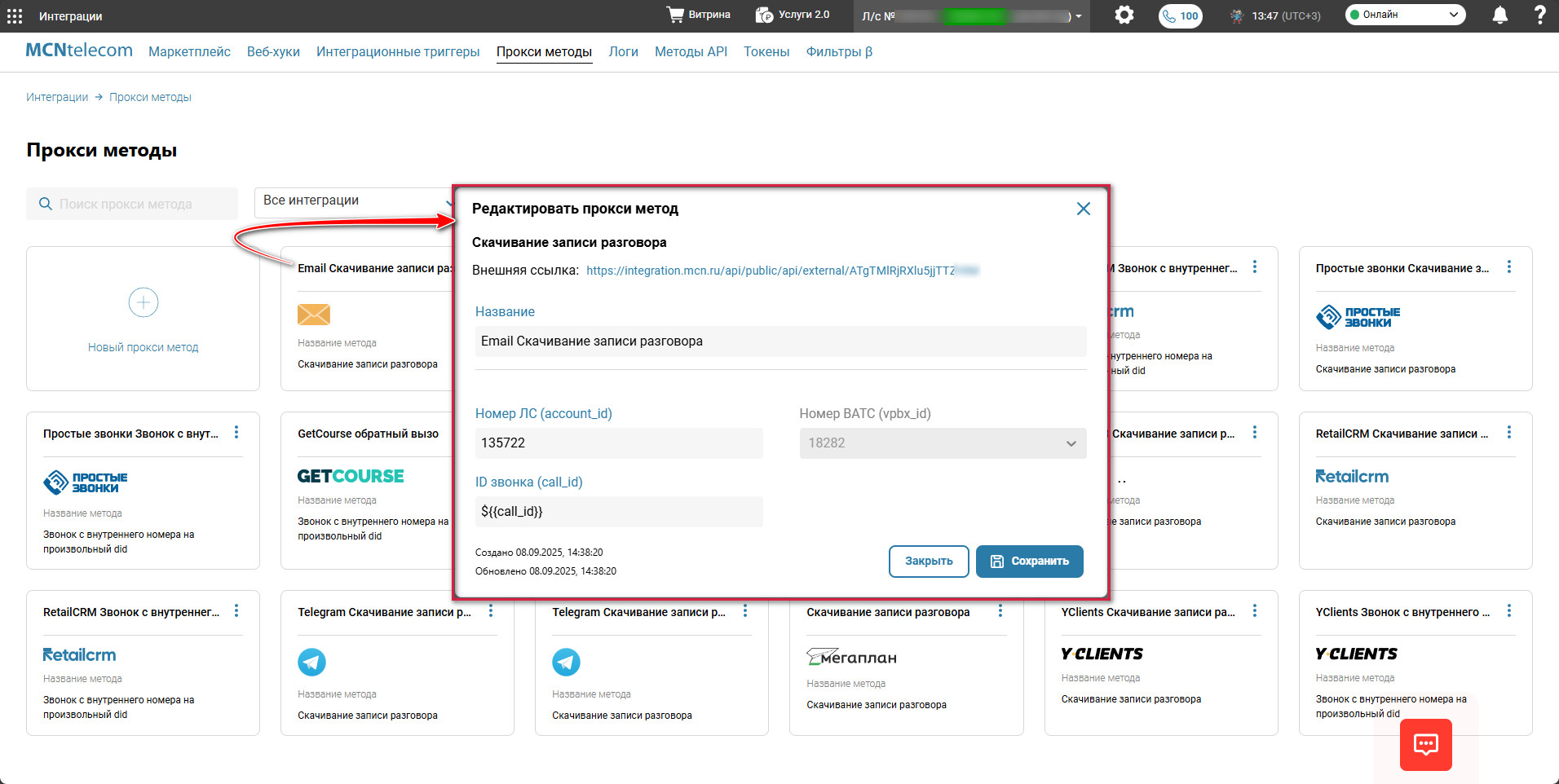 Прокси-метод «Скачивание записи разговора» создается автоматически одновременно с созданием интеграции.