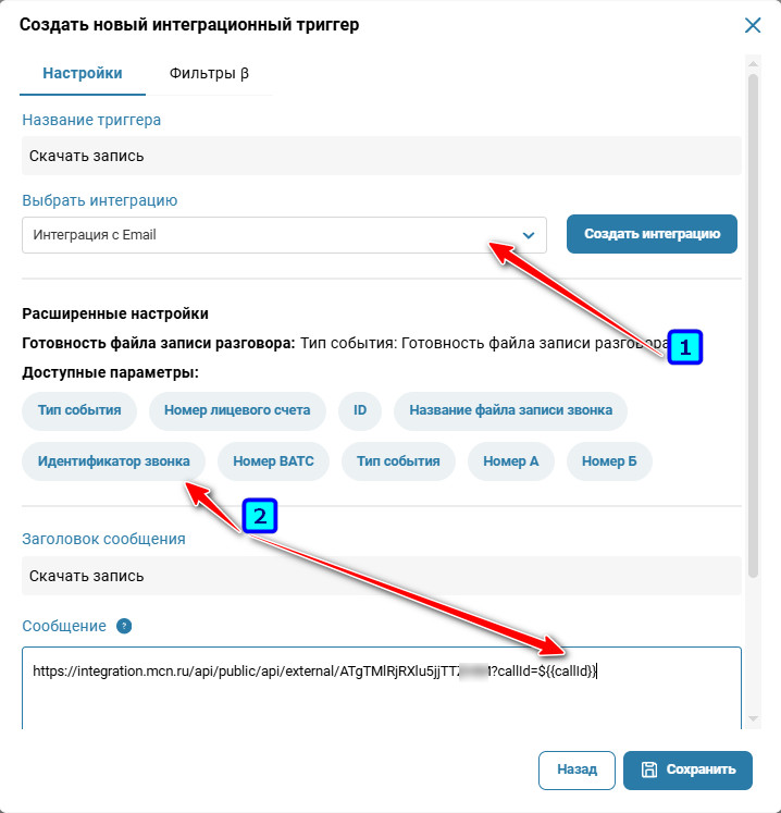 Перейдите в раздел «Интеграция» → «Интеграционные действия» и создайте триггер «Готовность файла записи разговора».