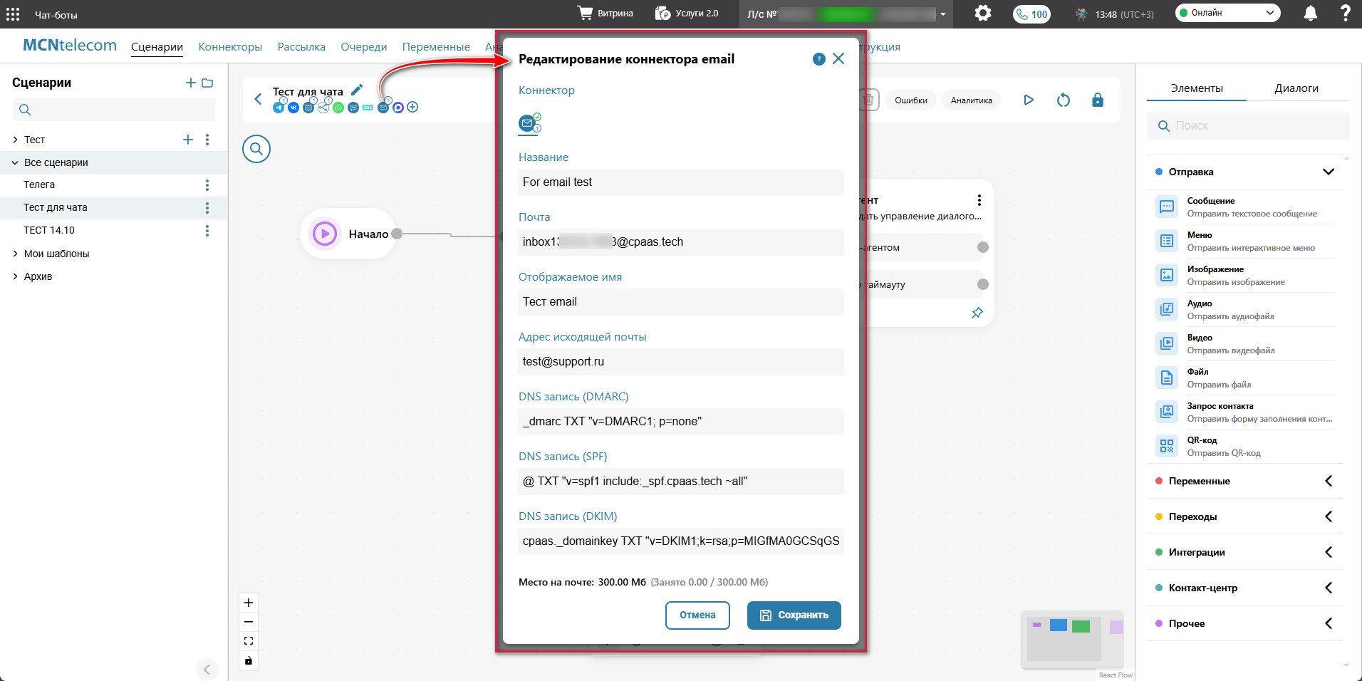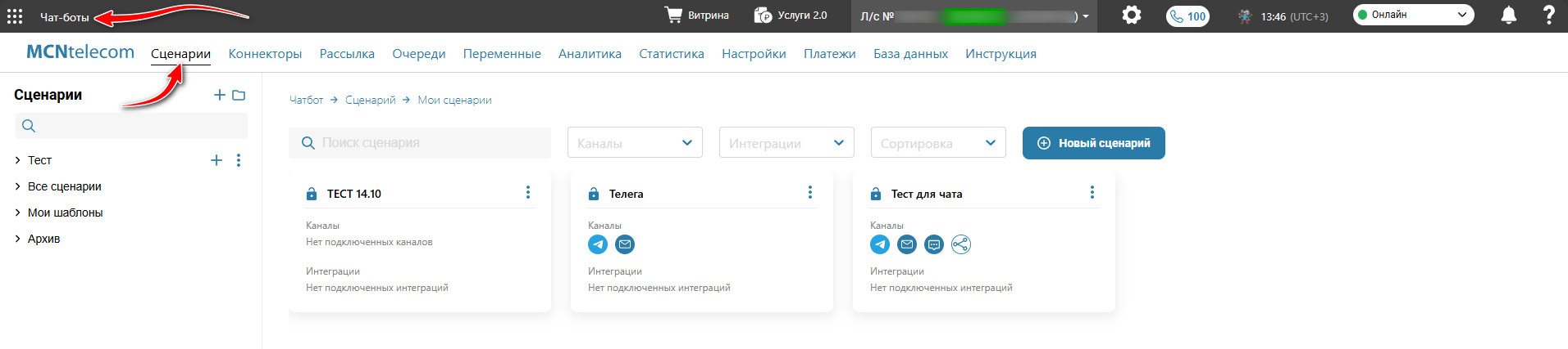 Перейдите в раздел «Чат-боты» → вкладка «Сценарии» → меню слева «Мои сценарии» и откройте сценарий, где требуется создать канал email.