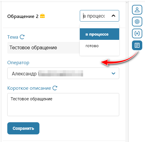 • Для просмотра или редактирования обращения, изменения статуса или оператора нажмите на кнопку с блокнотом справа.