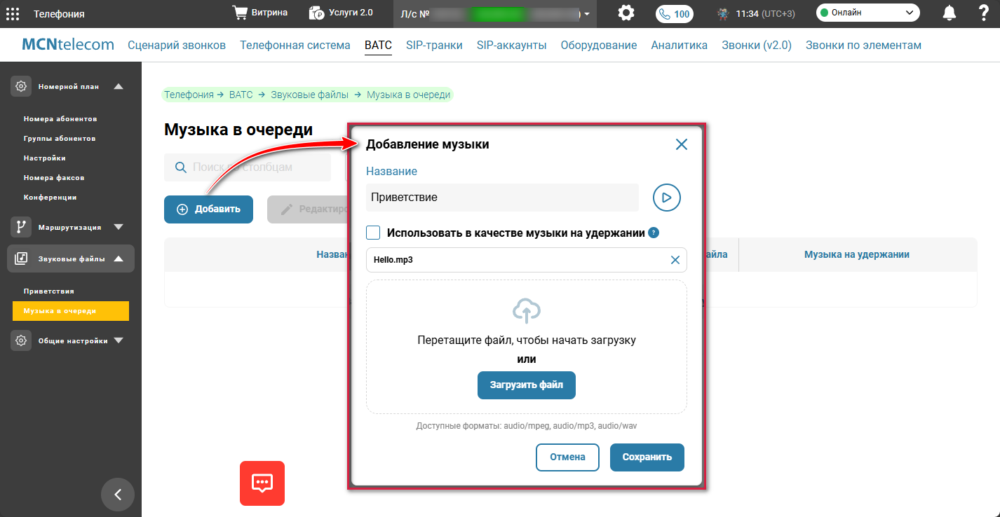 По умолчанию в виртуальной АТС включена музыка для очереди. Вы можете ее сменить и загрузить свою.
