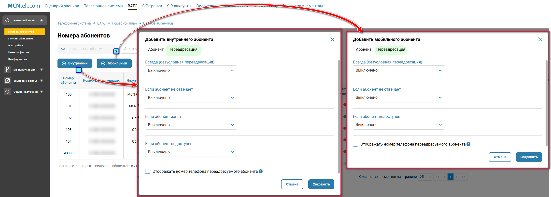 Переадресация настраивается в разделе «ВАТС» → вкладка «Настройки» → меню слева «Номера абонентов»«Внутренний» и «Мобильный» абоненты → вкладка «Переадресация».