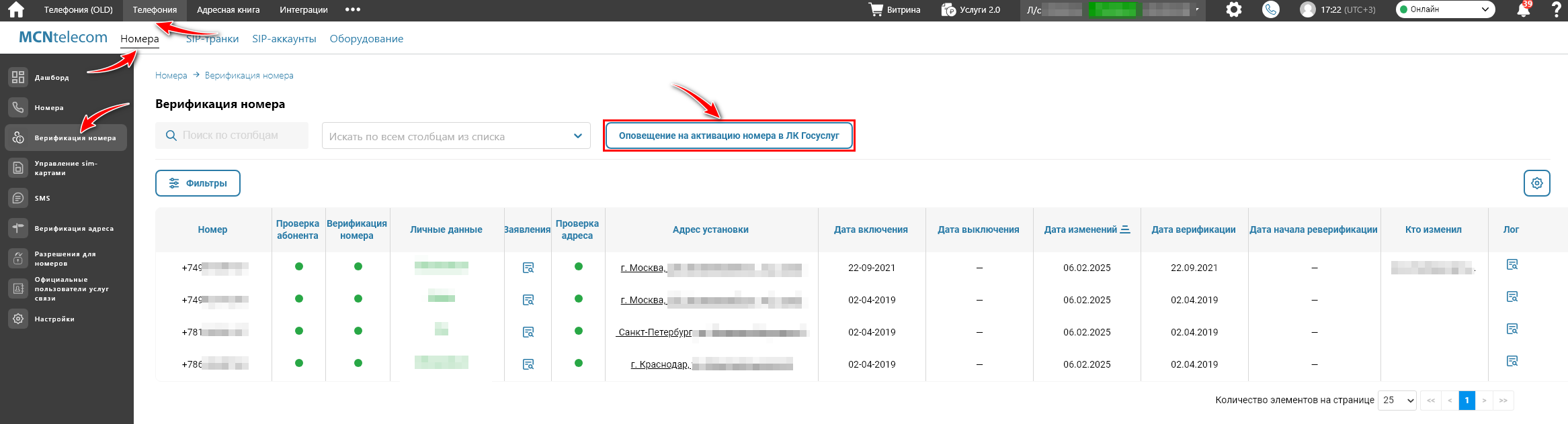 Перейдите в раздел «Телефония» → вкладка «Номера» → «Верификация номера» в левом меню.