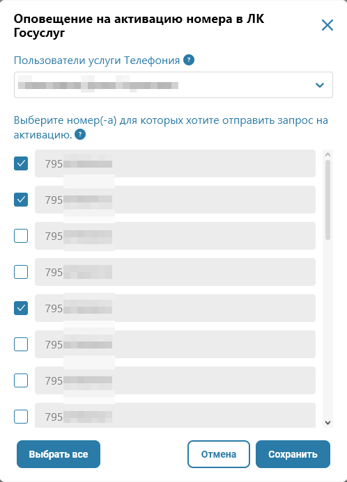 Выберите галочкой телефонные номера, которые указанный пользователь должен верифицировать через свой ЛК Госуслуг. Для выбора одновременно всех номеров нажмите «Выбрать все».