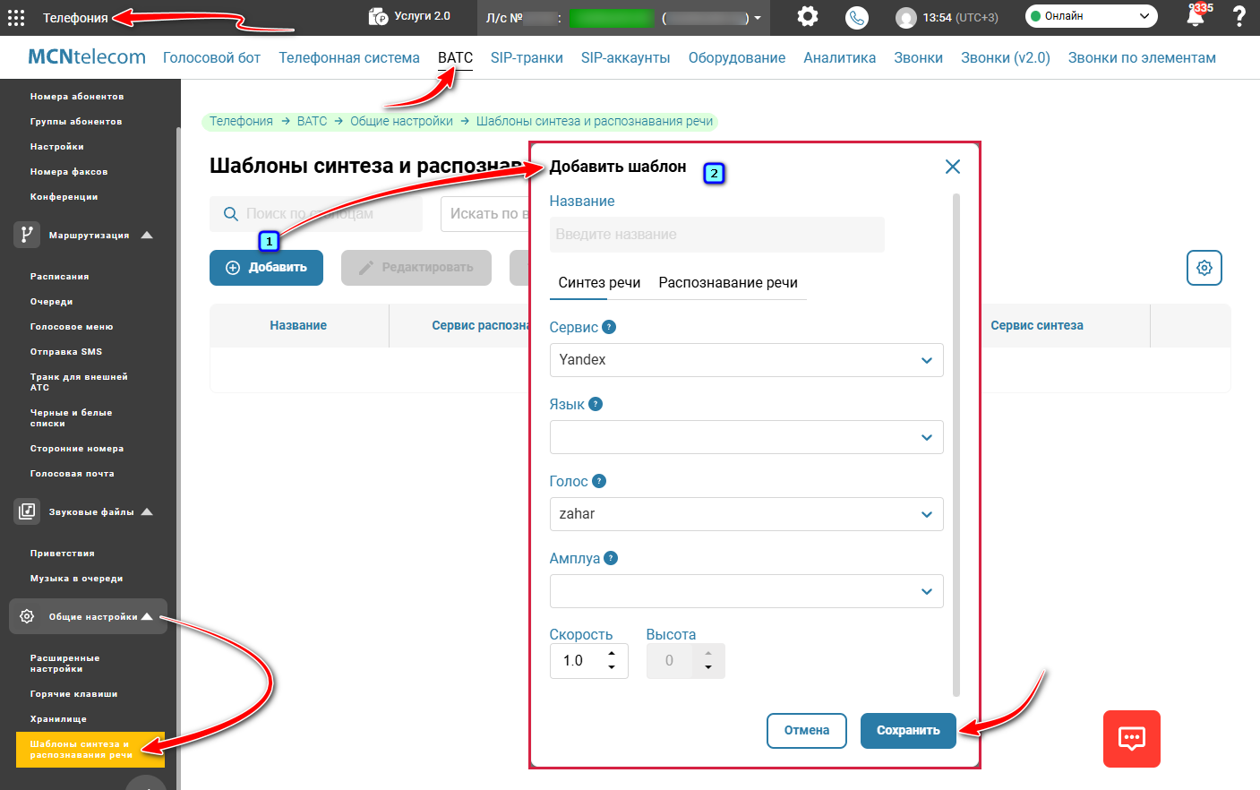 В данном разделе «Телефония» → вкладка «ВАТС» → меню слева → «Общие настройки» → «Шаблоны синтеза и распознавания речи» создаются и редактируются шаблоны для использования в элементах синтеза и распознавания речи в сценариях «Голосового бота».