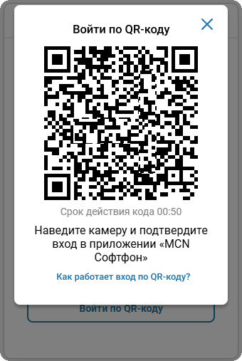 Отсканируйте QR-код через мобильное приложение «MCN Софтфон» установленном на вашем смартфоне. На странице входа наведите камеру в приложении «MCN Софтфон» на отображаемый QR-код.